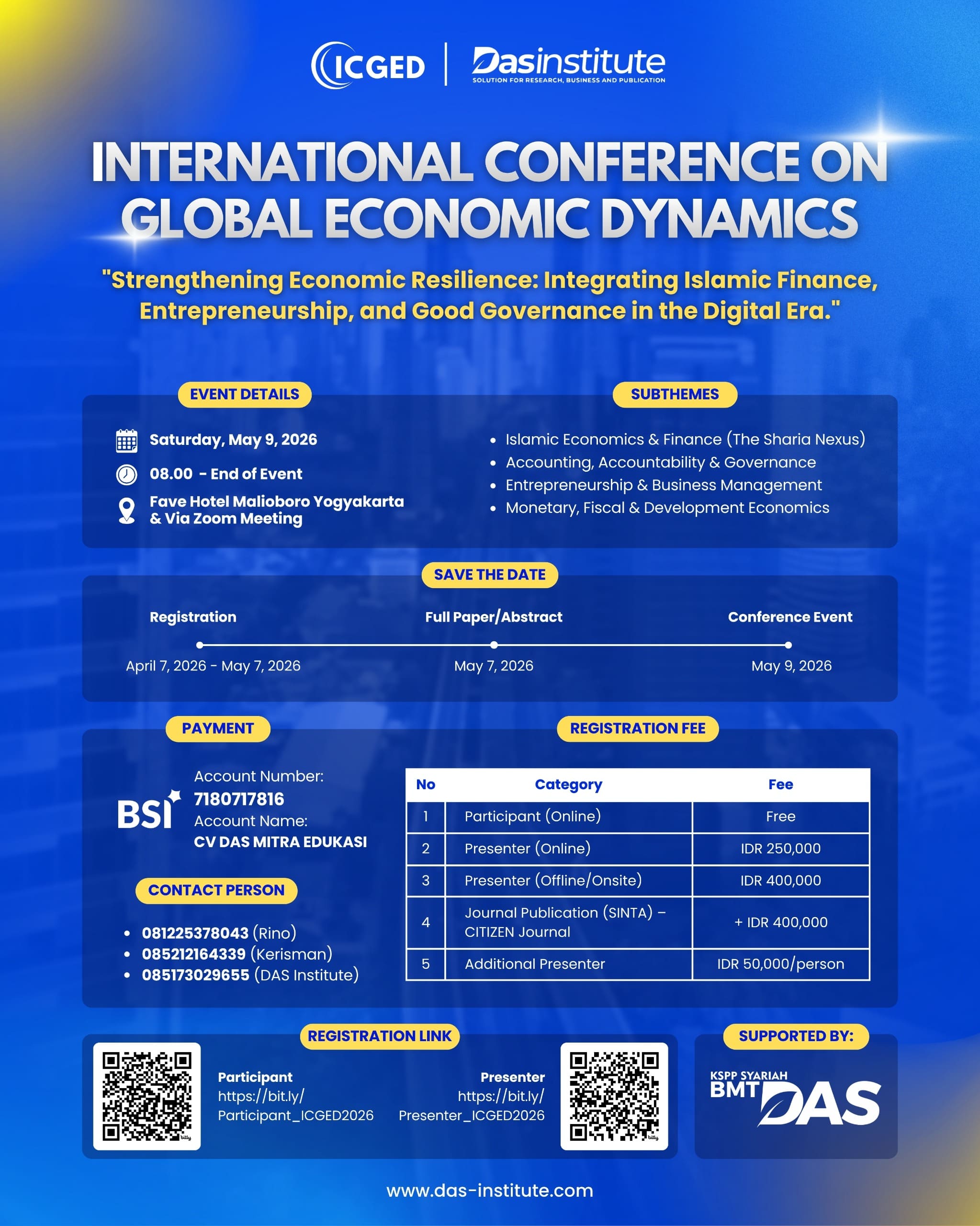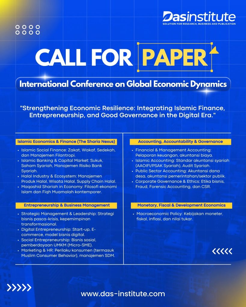 International Conference on Global Economic Dynamics (ICGED). Thema “Strengthening Economic Resilience: Integrating Islamic Finance, Entrepreneurship, and Good Governance in the Digital Era”. This conference is organized by the DAS Institute